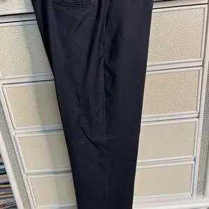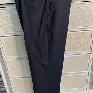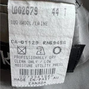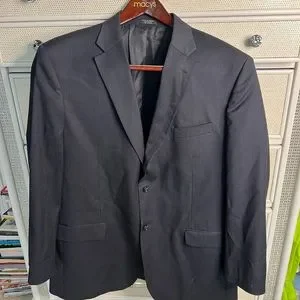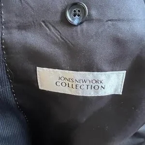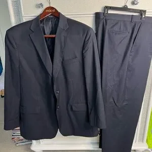 This is a Jones New York men’s suit. It is size 46L and pants are 40x30 and can be lengthened about another inch. The color is a dark navy with a black pinstripe. Beautifully lined. 100% wool