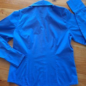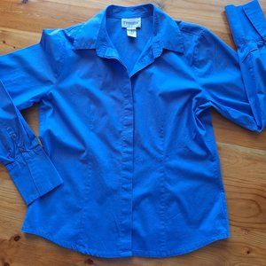 Top has princess seams front and back for curve-hugging appeal, double button detail at the extra-long cuffs that can be worn flat or folded, and extra material on the front to cover the buttons for a more clean look. Approx measurements: length 23.5", bust 20", sleeve 25", waist 18", hip 20". Pet friendly home but kept in spare room closet. Wood background is dining table, not the floor.