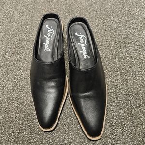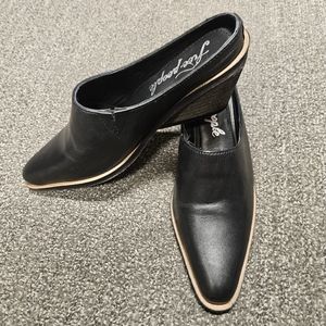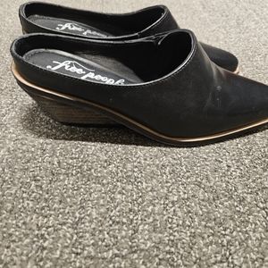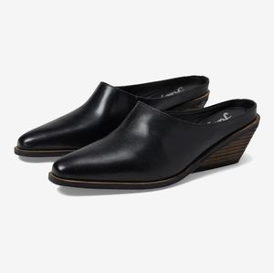 Features: Slip-on style, backless design, leather uppers, pointed toe, stacked wedge heel, lined footbed