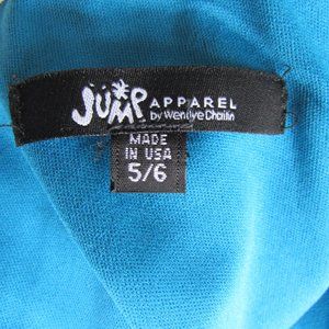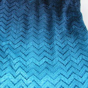 Strapless dress, perfect for prom or spring, summer wedding season. Ombre, glittery mermaid shaped dress is form fitting, wider at the bottom for comfort while walking. With true mermaid form in mind, this glittery fabric shell, is deep sea blues and greens, darker to lighter and then darker again near hemline. Open weave textured fabric shell is 98% polyester and 2% spandex and is designed to let the dark teal lining peak through. Light catching design is made in the U.S.A. by Jump Apparel by Wendye Chaitin. The lining ends at about 28 inches from the top of the semi-sweetheart neckline, below that marking is unlined. Zippered back, hook and eye closure. Rubbery band across bustline, cups do have some padding. Size is 5/6 in juniors. Listed in fair condition, have noticed some wear, pilling and loose threads at hemline.