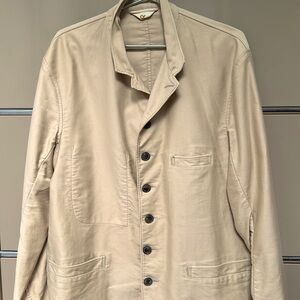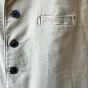 Awesome men’s jacket from our by 45 RPM. Vintage from about the early aughts. So many nice details. In good shape, pretty lightly worn but there are some small spots on the back and light discoloration on front pocket. No interior tag with size/material, but fits men’s large and is a sort of soft suede-y cotton-y twillish textile. Unlined. Feel free to ask questions!