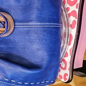 BLUE FAUX VEGAN LEATHER. large 11 inches wide x 12 inches long x 10 inches tall. This has many pockets inside including two zipper pockets. This bag is very roomy. Bundle with some of my other items to save on shipping!