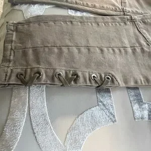 These pants are size 28. They have cute crisscross detail on the ankle. Like-new condition