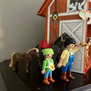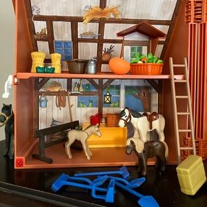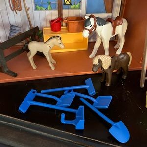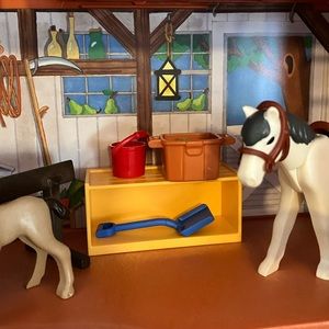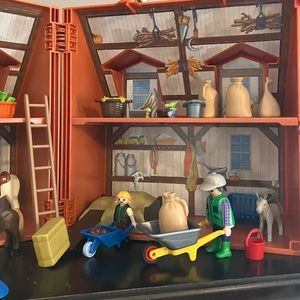 Playmobil set 4042 My Take-along Farm - barn opens for play, closes for storage. Two-story barn includes three adults, two kids, two horses, two ponies, a foal, and a donkey. Also included are many farm tools, grooming tools, two wheelbarrows, hay, veggies, baskets, birds in a nest, a manger, buckets, and a milk pail.