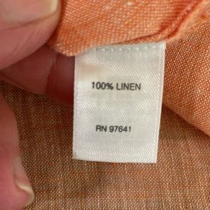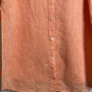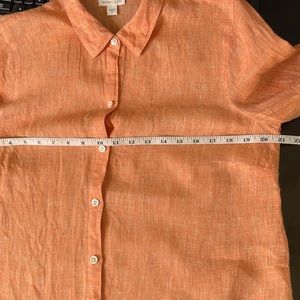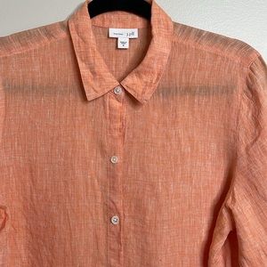 J. Jill top in very good used condition with no rip stains or holes. Bright coral color, button down, collared, long sleeve, high side slits on both sides, 100% linen, machine wash, size medium, dog friendly home. Classic, clean, and tailored shirt nice for casual weekends, travel, parties, cool and lightweight!