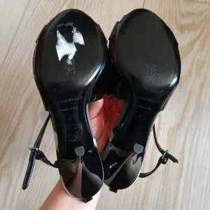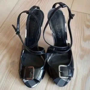 NEW Burberry patent leather crossover strappy heels. Authentic, open toe, adjustable buckle ankle strap, classic brit check around the midsoles. New, no box or dust bag, size 37. Sticker residue on the soles as pictured. First photo is stock, others are the actual pair being sold.