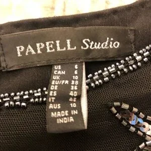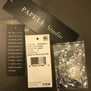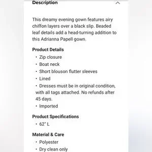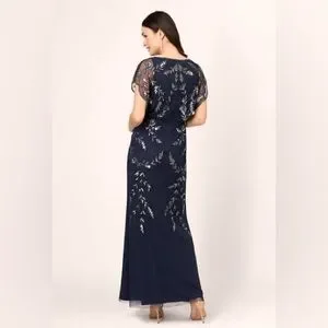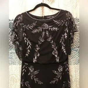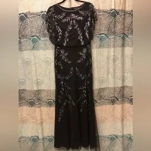 Adrianna Papell Studio Black Beaded Gown with flutter sleeves and blouson bodice. This dreamy evening gown features chiffon layers over a black slip. Beaded leaf details accent this gown with zip closure and boat neck. Dry clean only. NOTE: Worn once for a black-tie wedding. Packet of extra beads will be included. Last 6 photos are of actual dress.