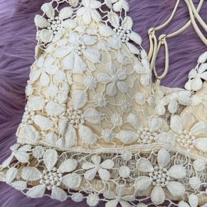 Bralette is by True by Rue 21 and is a pull on style with an elastic back, adjustable shoulder straps. Lined and lightly padded bra cups. Beautiful yellow lace