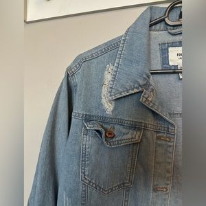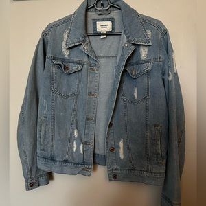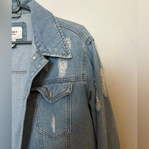 Jean jackets will never go out of style! This Forever 21 Distressed Blue Denim Jacket is the perfect staple piece to your closet. It is a size Small. While it is distressed, it has no additional rips, stains, or cuts. Material does not have much stretch but is very durable. Only worn a handful of times, so it is in perfect condition!