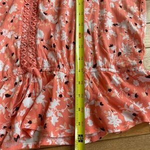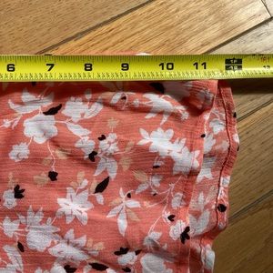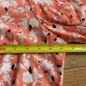 NWOT Adrienne Vittadini beautiful floral print blouse in colors of coral , white and black . Embroidered in the long vneck collar that goes down the front of the blouse. Very flowy blouse that gathers near the bottom to a fake tie to give it a flowy bottom . This blouse is so perfect for spring with short flutter sleeves ! Measurements in photos.