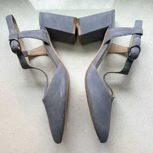 Johnston & Murphy t strap pointed heel shoe. Block heel makes the shoe very comfortable at only 3 inches tall. The shoe is very comfortable. Brand new with no boxes. Scuffs on the sole are due to wear around the home. Woman size 8. Color is like a periwinkle color. Material is suede leather.