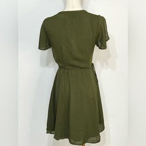 This Lulus olive green Harbor Point wrap dress is a size XS. It is a wrap dress and has an inner tie and an outer tie that loops through. It had the whimsical flutter sleeves and lining underneath the dress. It is made of rayon and is in good preowned condition with no flaws.
