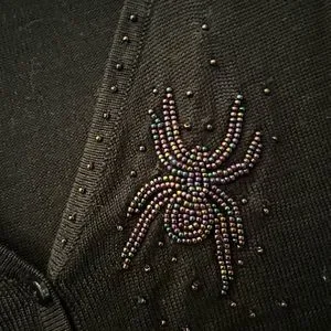 Original Betsey Johnson black small beaded cardigan with spider embellishment. Y2K purchase; style vintage. Some (one or two) beads missing along the collar. Small/Extra Small. Black.