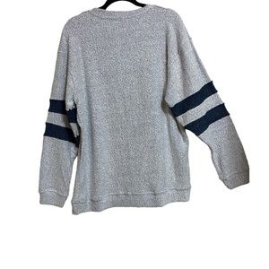 Pacific & Co Nubby Fleece Shirt Oversized Size L Gray with “groovy babe” in pink. Navy blue stripes on the arms. Perfect with leggings. New with tags. Excellent condition.