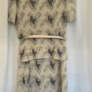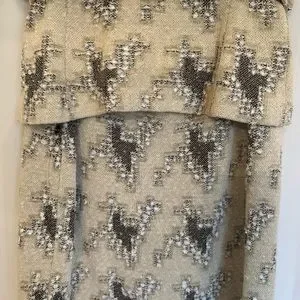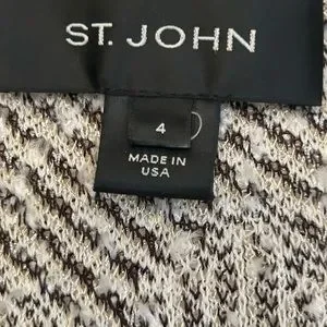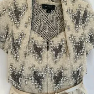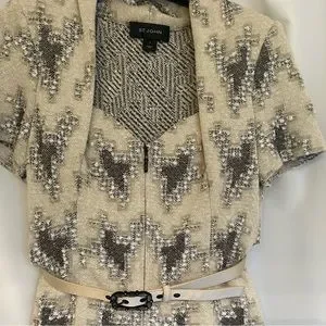 EXCELLENT CONDITION No rips , tears or pulls in JACKET or SKIRT * MATCHING BELT HAS TWO PLACES WHERE THE SATIN MATERIAL IS NOT SMOOTH. PLEASE LOOK at picture number 2 , THIS ST. JOHN SET SOLD FOR OVER $ 3500.00 at NEIMAN MARCUS ORLANDO FLORIDA! I wore it twice ever had chest done will not fit me anymore!ABSOLUTELY NO CALL OUTS !