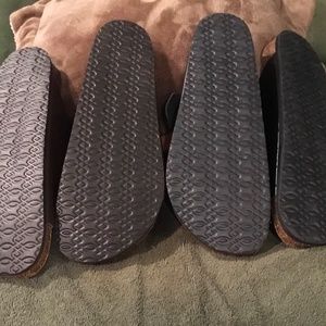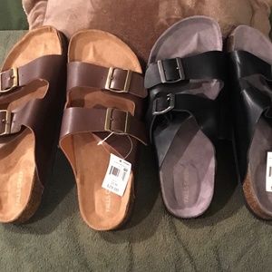 These 2 pair of slip on double buckle sandals are perfect for spring or summer. They features arch support with two straps to easily adjust for perfect fitting. Two pair. Both size 10M. One black pair, one brown pair. They retail for $28 EACH.