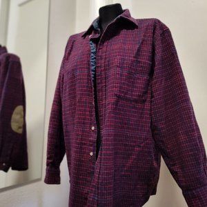gorgeous vintage plum colored wool pendleton shirt with blue pattern. Leather elbow patches. one chest pocket. Make me an offer!