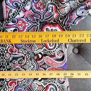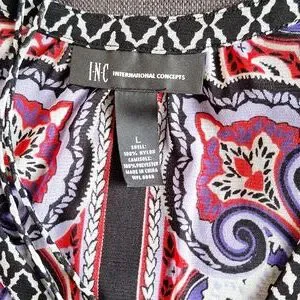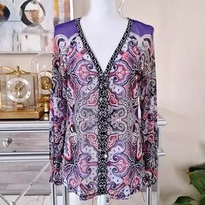 Beautiful INC TOP with a purple and coral Paisley print with black and white contrasting trim. Grommet lace up front and deep V neck.