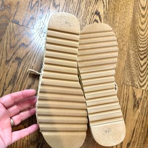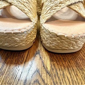 Beach by Matisse sisal sandals size 10. In box but no tags. Brand new and never worn. I have had two pairs of these and love them. These are too narrow for me. These run narrow so if you have a wide foot they may not work. 3.5 at their widest point. I would guess they run small and these wear like a size 9.