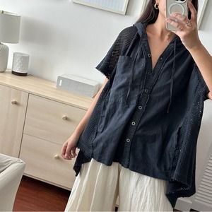 Amazing Draped short sleeve top with a button front, chest pocket, mesh detailing and hood