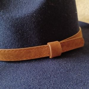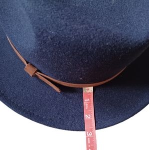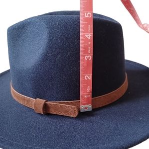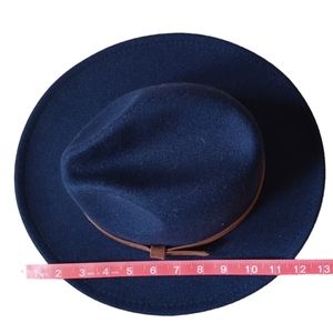 Gently used wool and polyester navy blue fedora style brimmed hat. The tie inside makes it adjustable, and the strap adds a classy, western flair.