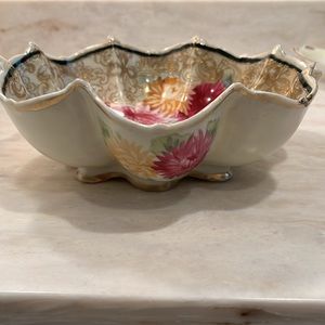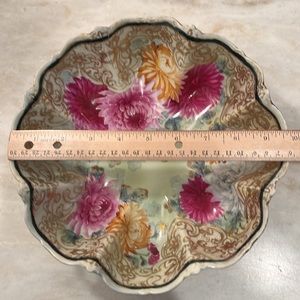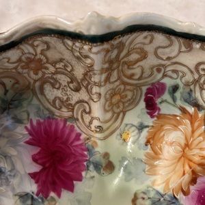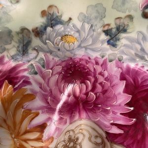 Green blue stamped Maple leaf Bowl of ornate painted Chrysanthemums & gold