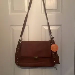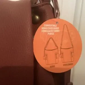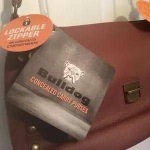 This reddish brown leather concealed carry cross body bag will serve your purposes well. New with tags and bulldog brand. Has lockable gun pockets on each side with keys still attached. Adjustable strap that makes it convertible to both cross body as well as shoulder. Mini inside pockets. Closure of the main flap with a push lock. Length is 28 inches but adjustable. The bag width is 15 inches. Bulldog carry bags are highly sold after as one of the best carry purses made in the USA.