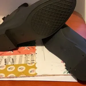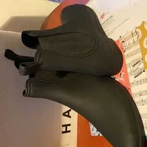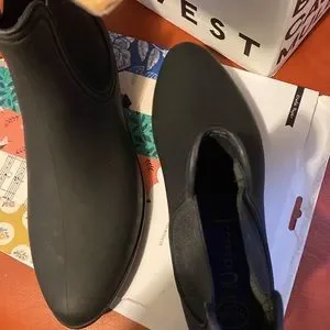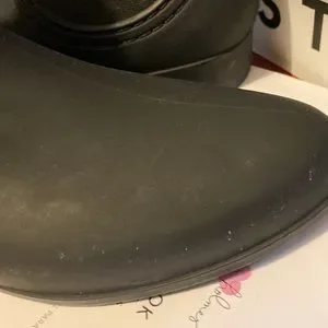 No serious signs of wear. A few mild signs in last pic. Pull on waterproof. Going to guess rubber type but material is very smooth and matte. Toe is slightly pointed for added style, making them look less like rain boots. Cute sturdy, just didn’t fit me