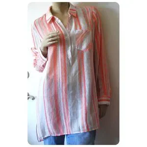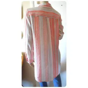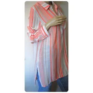 Beautiful light and airy top with peach, coral, beige, and cream stripes. One chest pocket. Half button placket. Longer back hem. 8 1/2" - 9 3/4" side slits.