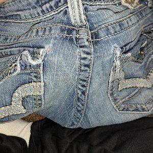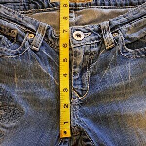 Big Star Sweet Ultra-Low Rise Embroidered Flap Pocket Jeans 28R ,Signs of Wear Condition 💥****Showing Signs of wear on Crotch area, pant leg hems and pockets (pockets were patched*** REFER TO PICTURES As is Please Read Description