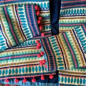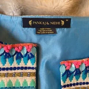 Pankaj and Nidhi Bizet striped blazer jacket with beaded collar, pompom cuffs and hem and hook-and-eye closure.