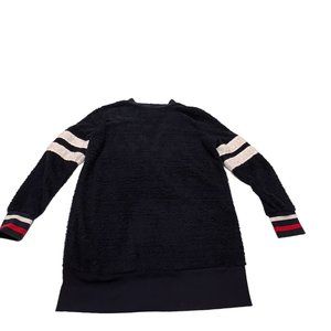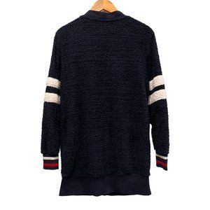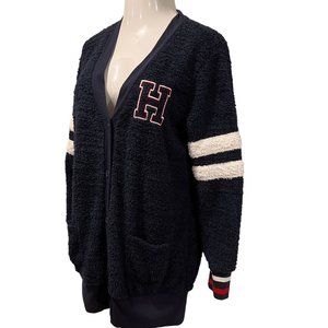 Cozy, v-neck, extra long button front cardigan done in a teddy fleece fabric with knit cuffs and hem. Preppy stripes on sleeves and cuffs, letter 'H' embroidered on front, and patch pockets. Cute sweater to wear out or lounge at home. Excellent condition. Size large.