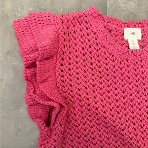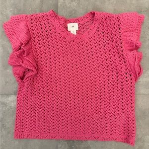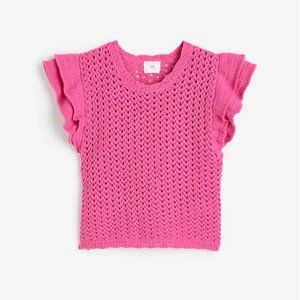Short, crochet-look top in a soft pointelle knit made from a cotton blend. Round neckline, short, double-layered flutter sleeves, and gently scalloped edges at neckline and hem. Size medium.