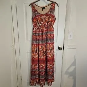 Pre-Owned. Like-New. Excellent Condition. Gorgeous Maxi Dress. Red, Orange Floral Patterned Design. Sleeveless.