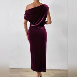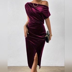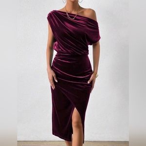 New Luxe Velvet Ruched Asymmetrical Neck Midi Dress Burgundy Red Wine