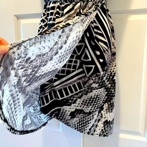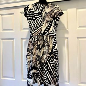 This beautiful all occasion dress has an abstract, mixed print with geometric/snakeskin pattern. Very chic!