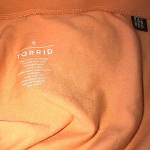 Torrid two pairs of Leggings wms plus sz 6x(30); white & peach color. They are gently worn, worn only once or twice. Washed in cold water and hung dry ( no dryer). Please see pictures for more information. I don’t have stock photos of the leggings but they are Torrid quality leggings. They have tons of life left in them. I paid $22 each for them new. The pics flash show color of peach lighter than they are. The first picture shows correct color.