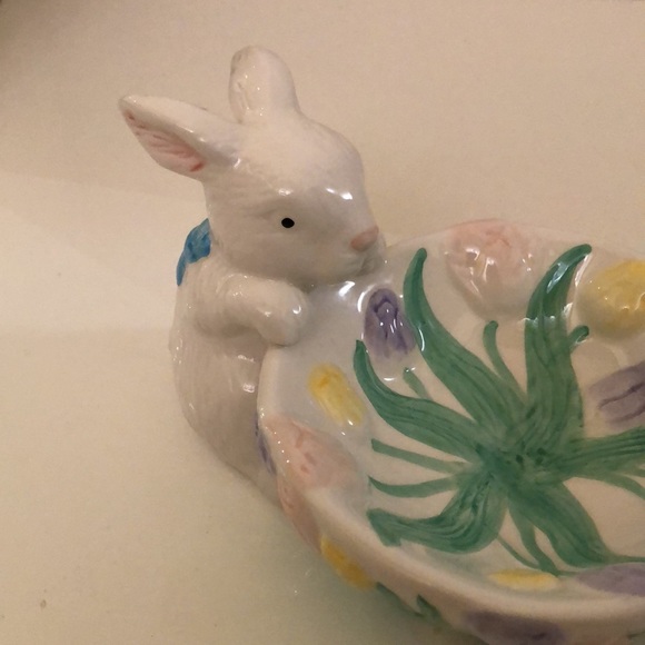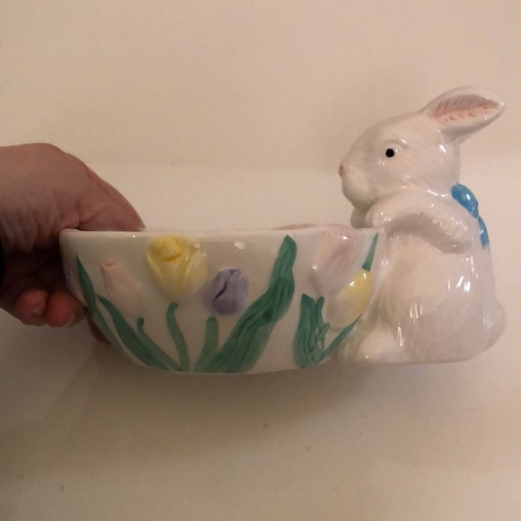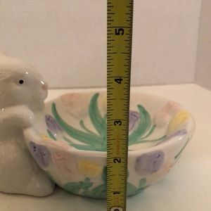 Pretty ceramic bowl with bunny Bowl is approx 5 1/4 inches Height of bowl 2 inches Height of bunny 4 1/4 inches See pictures close up for details