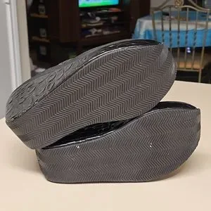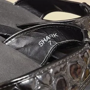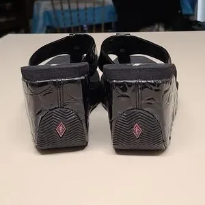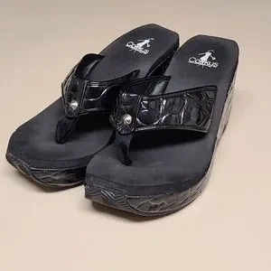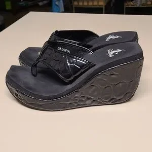 Corkys Shark platform wedge sandals. Black Textured faux patent leather upper and toe strap, Silver hardware accent and high grip rubber soles. Size 7, in excellent used condition.