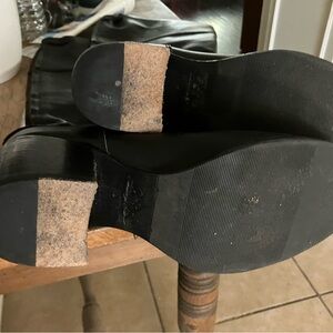 Round toe riding boots, zipper closure at back with button strap detail. Leather Tall Loretta Heeled boot. Shaft 14”, height 14”, circumference 2 and half block heel. Worn a few times. Very good condition. This color is Black also offering same boot in brown