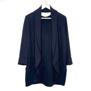 Tuxedo-inspired, open blazer with tacked three-quarter length sleeves. Wool blend. Silk trim.