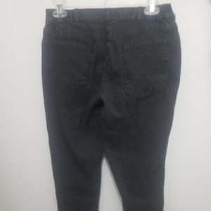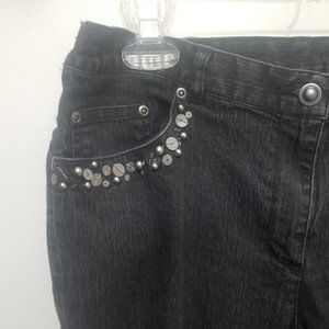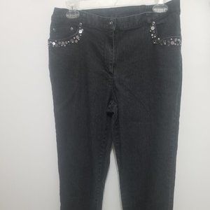 Ruby Rd size 10 women's jeans, black with silvery sequins and beads added to the front pocket borders (which the tag warns never to iron). In addition to two large pockets on both the front and the back, there's also a fifth pocket inside a front one. 54% ramie, 33% cotton, 11% polyester, 2% spandex. Very good condition!