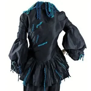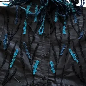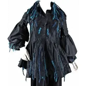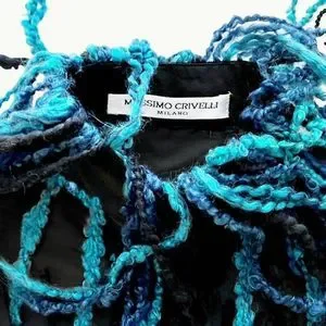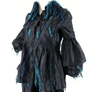 Emerging designer from Milan, Massimo Crivelli's, silk taffeta blouse with embroidered accents in blues, turquoise, and black. A novelty piece that goes with jeans to your dressy separates and will certainly draw the attention you deserve.