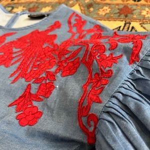 This is a stunning float top with blue chambray cotton base and red appliqué design across the chest.