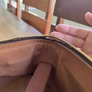 Interior: very clean in main compartment, shiny gold hardware, water stain shown in photo