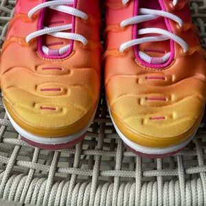 Authentic Air max plus sunset shoes, in good condition - lots of pics to see condition of shoes- some small marks on front but not noticeable does not take away from these very cool shoes- great pop of color - needs inserts inside of shoes- see video and pics - priced accordingly ππ