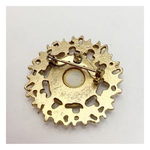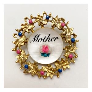 Vintage MCM mother of pearl “mother” pink blue gold round brooch pin