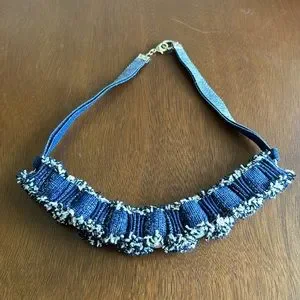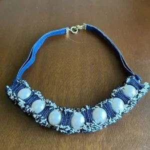 Statement necklace with unique combination of denim & jumbo pearls. 20” long