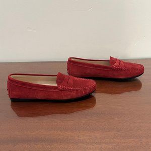 Currently selling for $695... this is a steal! NIB and never worn! Perfect condition with no scuffs, scratches, or sign of wear. Tod's craftsmanship is clear in these driving shoes style loafers. They are hand stitched, have penny slots, and rubber pebbles on the outsoles that prevent slipping. Made of red calf suede. Monogram is hot-stamped at the front of each shoe (that is not an imperfection!). Comes in original box with dust bag and booklet. Made in Italy.