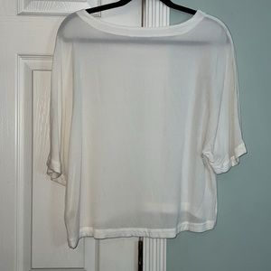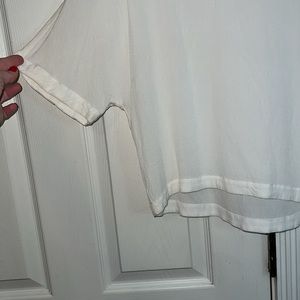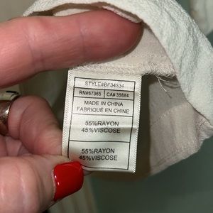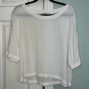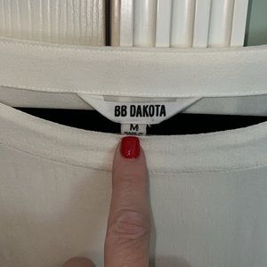 BB Dakota blouse that has a "crepe" feel to it. It's aa little on the shorter side measuring 22" in length and 20" pit to pit. Can be worn alone or as a shell! Cooley is ivory, pre loved no flaws.